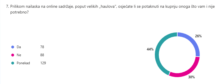 Najviše učenika (44 %) odgovorilo je kako se ponekad osjećaju potaknuti na kupnju onoga što im nije potrebno prilikom nailaska na online sadržaje.