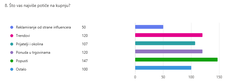 No, prema rezultatima ankete, najčešći poticaj na kupnju upravo su popusti (147 učenika). Popusti ponekad mogu biti dobre prilike, ali ljudi postaju zaluđeni njima, najčešće tijekom Crnog petka (eng. Black Friday). „Ljudima je tada teško odrediti granicu između toga je li im zaista potrebno to što su kupili ili su tu stvar kupili samo zbog toga da iskoriste popust uoči toga dana. Popusti, ono što vidimo na policama, pjesme u trgovinama, reklame koje nam se prikazuju svakodnevno, sve to vrlo je strateški napravljeno kako bi se proizvodi bolje prodavali, a proizvođači bolje zarađivali”, objašnjava prof. Starčević.